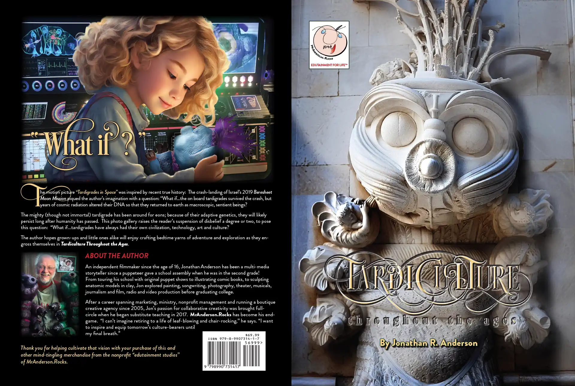 With a fantasy history mirroring human civilization, this is the Coffee Table Book that inspired the Tardigrades in Space™ Trading Card Game! Featuring over 500 original artworks extrapolated from the author’s proprietary Tardibabe Puppets, the endless visual details of this collectible coffee table book will delight readers from 18 months to 88 years old. “Seriously, my toddler grandkids went bonkers, and Jr. High science teachers gobble it up!” ~ Author